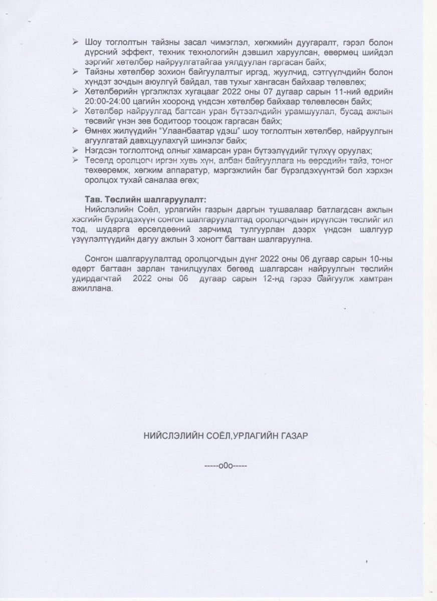 Үндэсний их баяр наадмын хүрээнд зохион байгуулах "Улаанбаатарын үдэш" шоу тоглолтын хөтөлбөр , найруулгын төслийг сонгон шалгаруулах урилга
